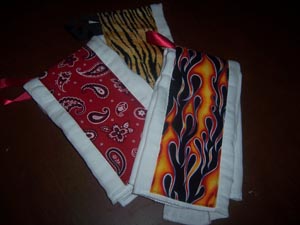 I’ve been seeing these on Etsy and wasn’t quite sure about them. Of course, I grew up in a family that has been crafting for YEARS and YEARS. Their approach to burp cloths is to crochet around the edge of cloth diapers. But I notice that people on Etsy were taking them a step further, so I gathered a couple of ideas and designed these. The tiger stripe is the other half of the baby gift mentioned in a previous post. The red handkerchief and the flames are for a couple expecting their second boy. She is a cowgirl and he is a hot rodder so the fabric kind of screamed…….”use me!”