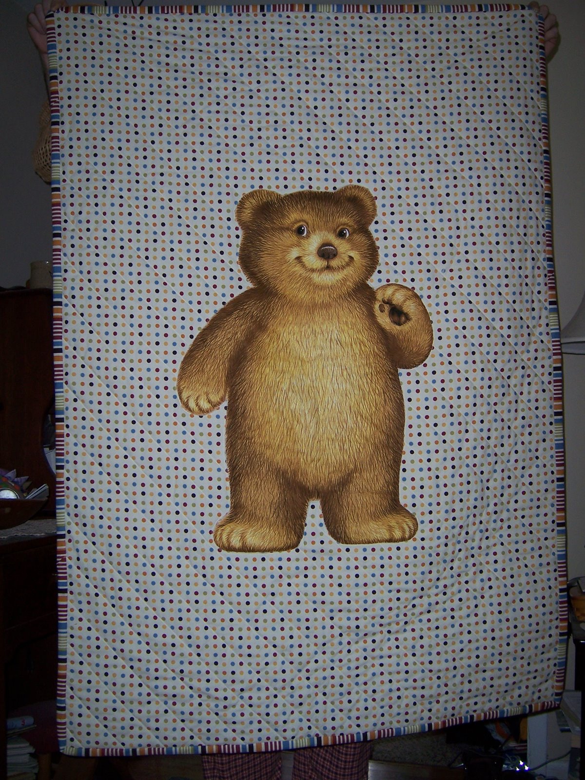 The bear had such personality in his face and I loved that I could get the coordinating stripe with the polka dot fabric. The back is simply pale yellow flannel since there was no back panel. I love this one! And it went to a very needy home.