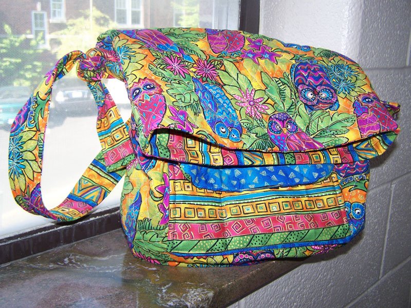 I like several of the design elements of this bag, but they are proving to be a problem in functionality. I liked the straps and loop configuration but my strap knots keep slipping through the loop so I have temporarily fixed it by tying a knot. And that slips too. Either I carry too much junk (what would I have carried in an 18 1/2″ bag!) or my straps are not fat enough (go figure, didn’t know I had anything not fat enough!) or I just have high hopes……I think I need to convert to a buttonhole and large neon button. I always love a chance to innovate and personalize. And this pattern has definite potential.