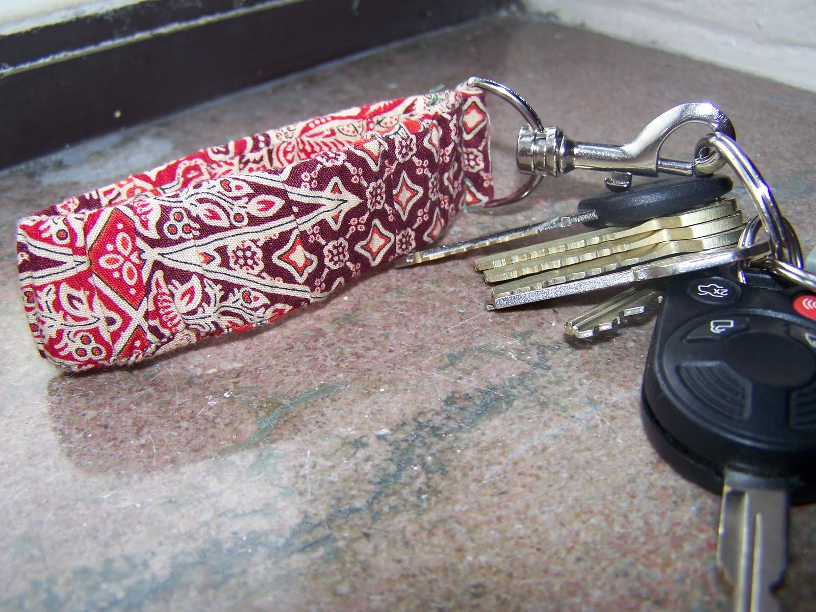 Batiks By Design recently opened a retail store in my town. I’m pretty excited about it. I had to purchase a couple more batiks at the grand opening along with this fat quarter in red. I picked up the idea for this key chain off a blog that I read about sewing, CraftGossip.com. One post was about creating keychains with fabric and elastic and if it is one thing I like better than bags, its keychains.