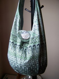 I finally reached a decision on what to do with the treasured yard of green Indonesian Batik purchased from Batiks By Design at the Paducah AQS show. After much deliberation and study, I chose a bag pattern borrowed from my mother. It was a “fat quarter friendly” pattern purchased, but never used, from several years ago. I forget the name of the company at the moment. My greatest concern was to use a bag style that would show off the whole border print to it’s best advantage. Even though this pattern was written for fat quarters, I was able to adapt it to regular yardage and had enough left over to use the batik as the lining as well.