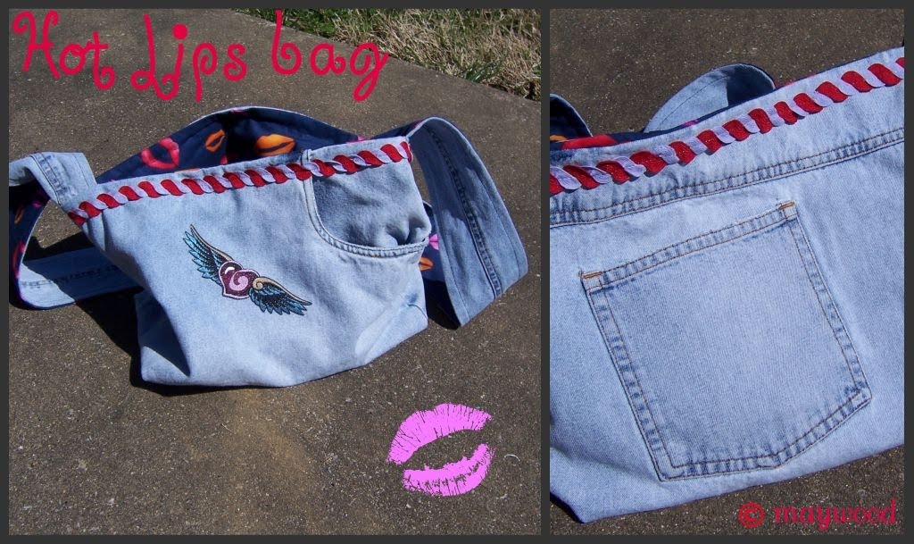Making bags, for me, is like eating potato chips for most people. You can’t stop at just one. And this week has been not different. After the hoodie project was finished and blogged, I couldn’t stop. Next came the recycled jean bag that can be called nothing but “Hot Lips”.