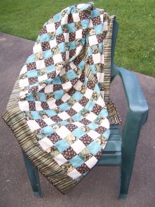I will be the first to admit this is a rush job but it turned out well nevertheless. A special person close to my family got married last weekend and I decided much too late into the engagement to make her a quilt. I debated over colors and pattern much too long, never really feeling like I had the perfect combination. But it turned out beautiful. The fabrics blended well but the four-patch pattern was nothing outstanding. And the sad thing is I determined the colors by sneaking a peek at the dinnerware the bride had registered at a local gift shop.