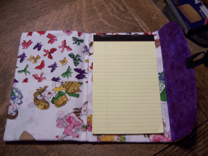 I’ve been trying to pick out just the right fabrics. It would have happened sooner but my husband had hidden the fresh notepads after leaving his former employer. Oh, and the inside is fabulous as well! (Notice the sewing diva lining.)