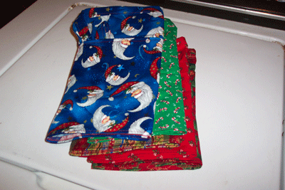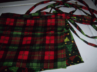Above is a photo of the first prototype. I’ve never worked as a server but I can understand being particular about the design of the tools of my trade. The aprons to the left were thrown back at me as not being acceptable. The pockets simply MUST be deep enough to hold wrapped straws or the apron is worthless. So I tucked my sewing tail and decided to now pursue the apron thing. Until my husband, a local restaurant assistant manager, announced that he had 3 servers waiting on their holiday aprons using their required dimension. So after a day of joy, and a day of re-designing and a day of cutting and sewing, I was able to produce 6 of the second prototype which you see in the photo to the right. Fingers crossed! These went to work with him today. Let’s see how they work.