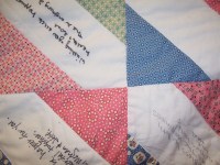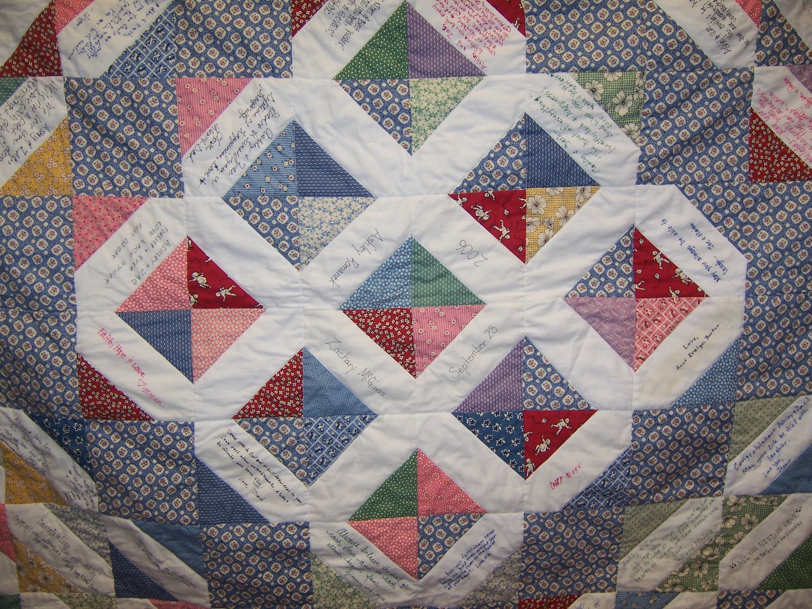 A dear nephew married over 4 years ago. We were unable to attend the wedding in Houston but remembered an idea his mother, my sister-in-law, had given me years ago. So I set about making memory blocks. I used a block from an Eleanor Burns book and pieced together muslin with several 30’s reproduction prints that I had left over from another project. I boxed the blocks up and sent them on their way with my sister-in-law. She distributed them, along with sharpie markers to family, friends, and guests.