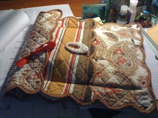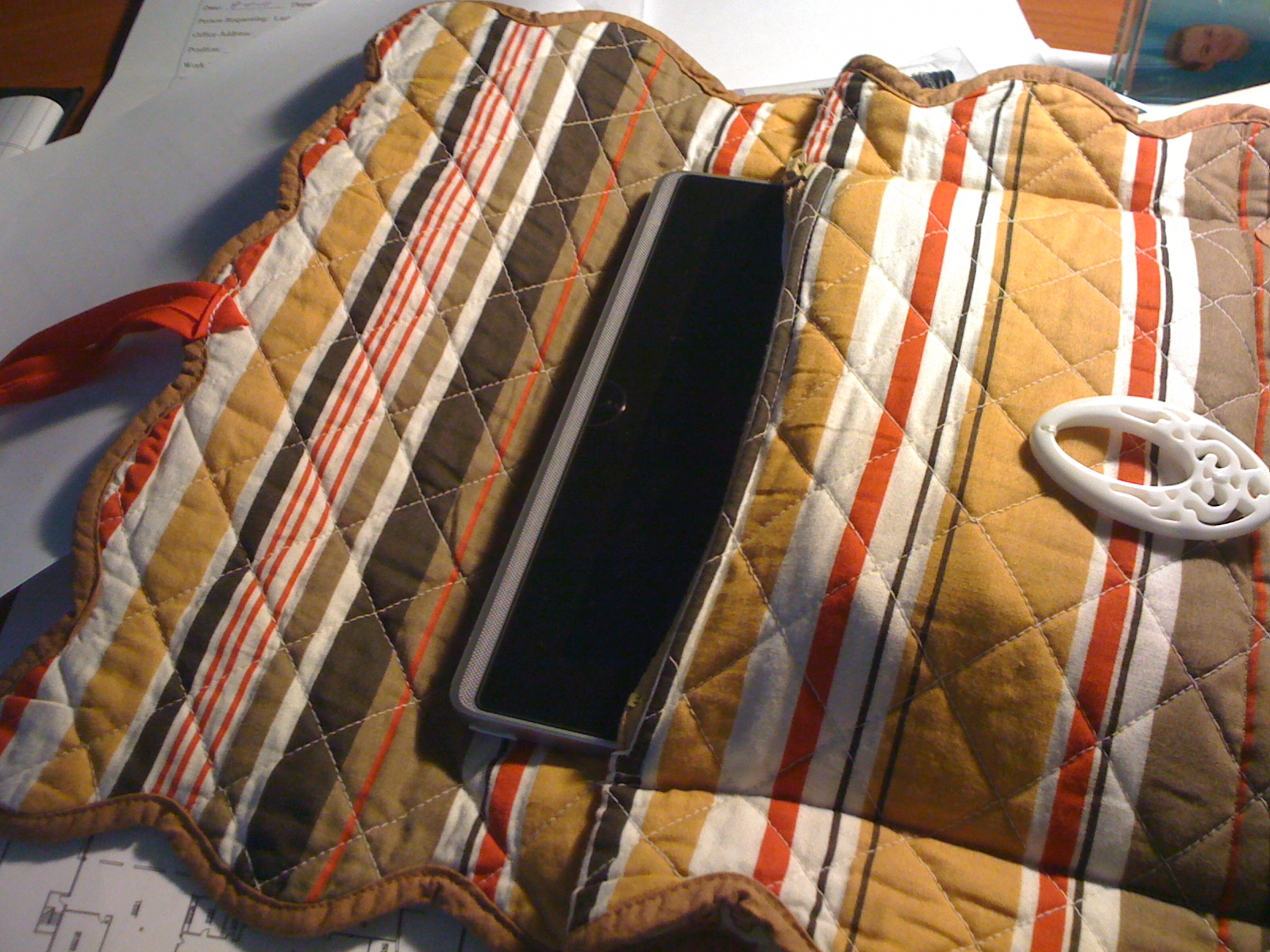 One design problem: I can make a cover for my Slate but it loses battery power rather quickly so I can’t take it very far without needing the power cord so I needed a pocket for the large power converter and the associated cords. And this is what I came up with. It is hard to see in this photo, but a zipper was inserted in the fold on the top place mat and then the place mat was folded and stitched down to create a pocket that barely holds all my accessories.