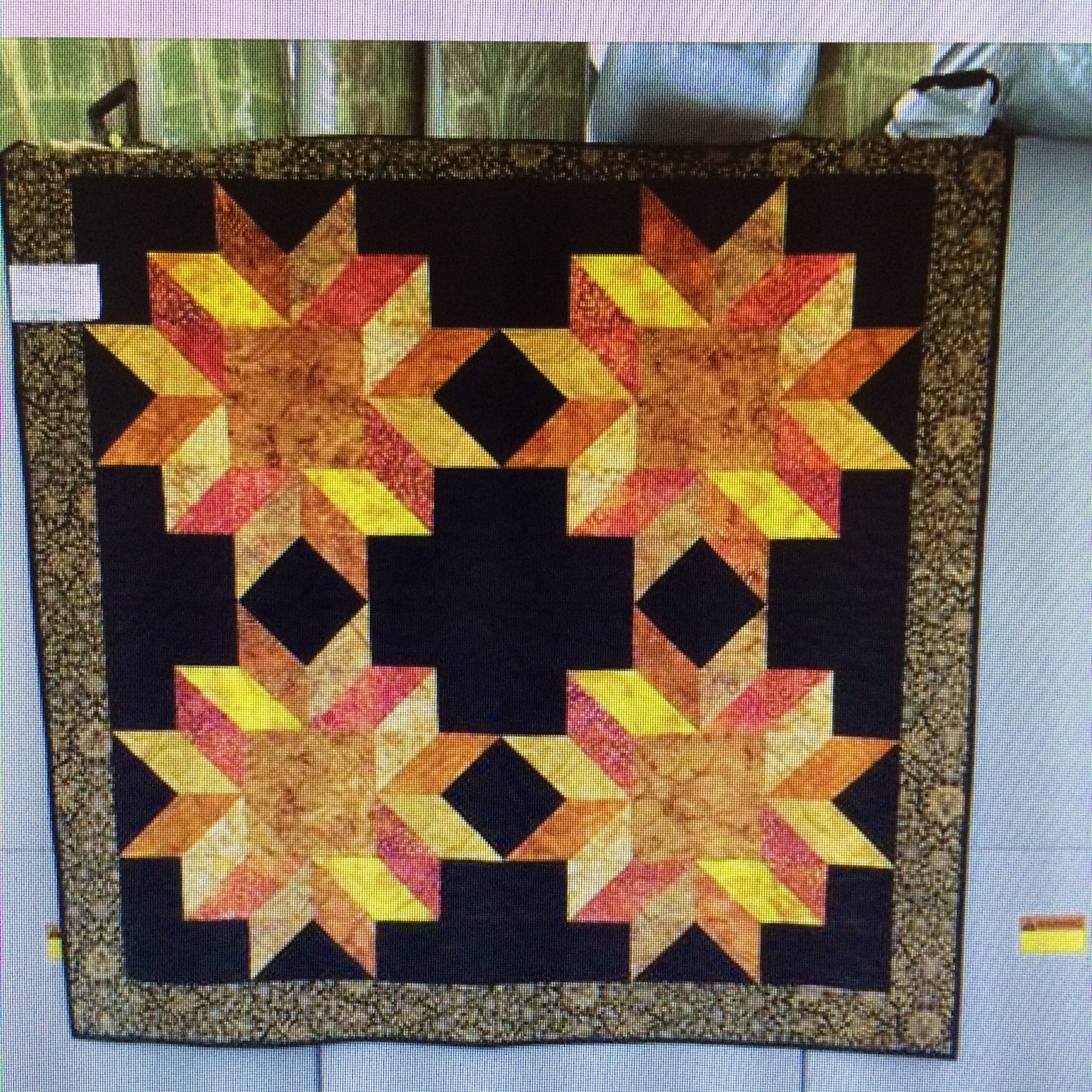 My local quilt shop, Backyard Fabrics, recently expanded her tiny store to include a large room that includes a classroom. She has begun to offer some classes. She tells me she has a long list of teachers anxious to teach. Thanks to the wonder of Facebook, she has posted photos of the upcoming classes and last week, she posted one that really caught my eye. The class is for the wallhanging photo posted here named Chick N Stars.